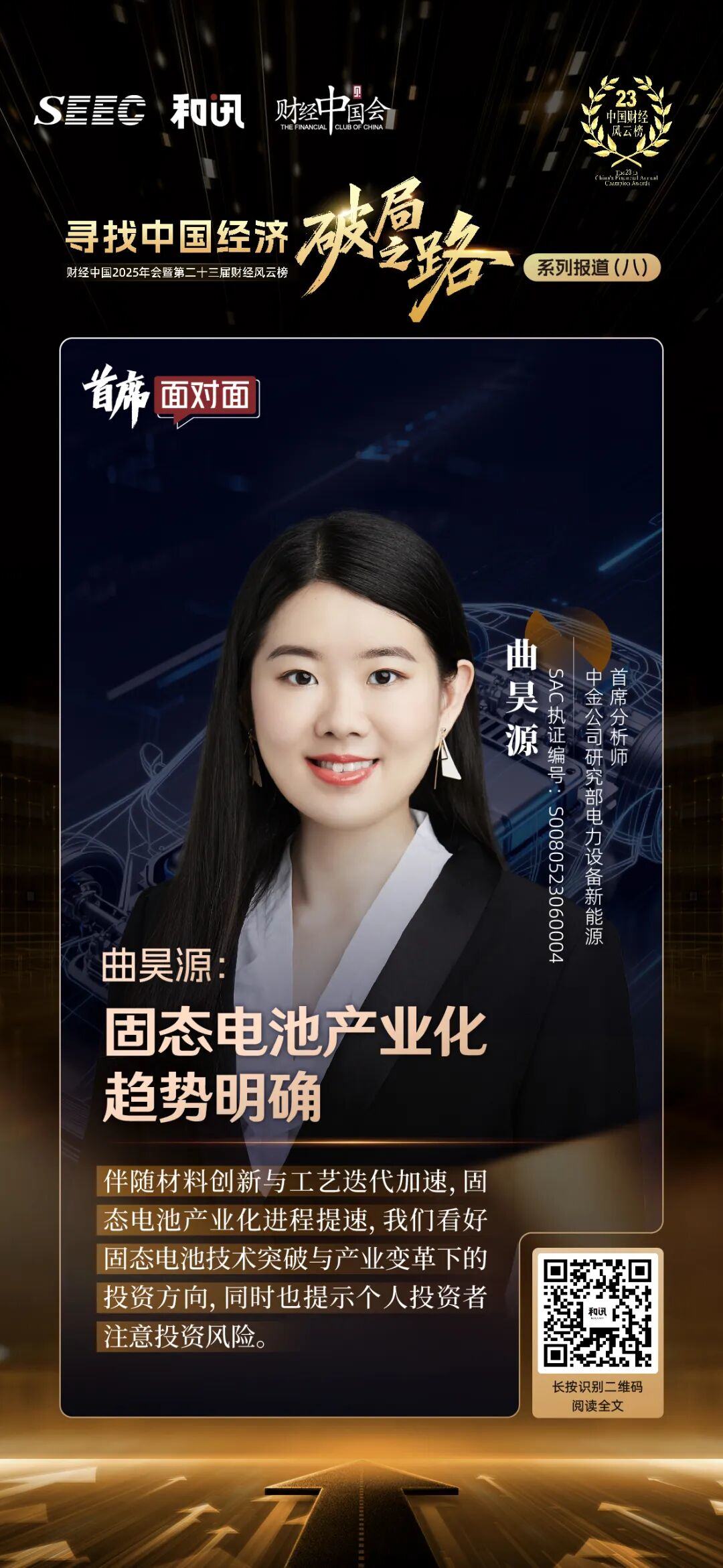 围绕这些问题,11月21日,和讯网特邀中金公司研究部电力设备新能源首席分析师曲昊源,针对固态电池的产业进程与投资节奏,展开一场深度对话。