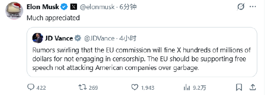 美国副总统万斯在X上发帖称:“有传言称,欧盟委员会将对 X 公司处以数亿美元的罚款,因其未审查内容。欧盟应当支持言论自由,而非因一些毫无意义的指控而去攻击美国企业。” 马斯克回应万斯的帖子称:“非常感谢。”