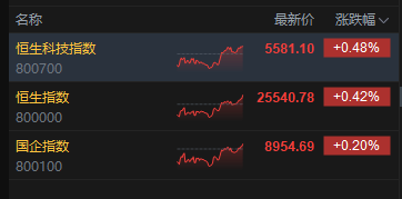 12月10日消息,港股三大指数集体上涨。截至收盘,恒生指数涨0.42%,报25540.78点,恒生科技指数涨0.48%,国企指数涨0.20%。盘面上,科网股涨多跌少,美团涨超2%,百度、阿里巴巴、小米涨超1%,哔哩哔哩跌超1%;黄金股强势,灵宝黄金涨超9%;内房股走高,万科企业涨超13%;今日两只新股上市,图达通涨33%,宝济药业涨超138%。