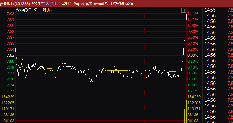 银行股在收盘集合竞价阶段出现异动走势,板块指数放量直线拉升翻红。农业银行(601288)临近收盘垂直拉升由绿转红,中国银行(601988)、工商银行(601398)、交通银行(601328)、邮储银行等尾盘就出现放量抢筹现象,并均以全天最高价报收。
