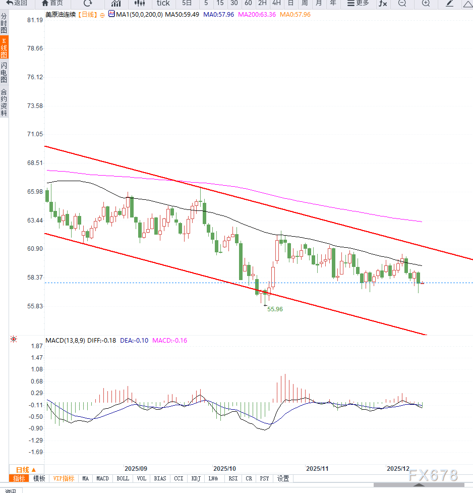 这种表现反映出投资者对于地缘事件的敏感度正在下降,因为主导油价走势的因素正逐渐从“短期风险”向“中长期供需结构”转移。PVM Oil Associates 指出:“美国扣押委内瑞拉油轮本应刺激油价强势反弹,但市场的淡化反应表明供应过剩的主导叙事仍未改变。”与此同时,国际能源署在其最新月度报告中进一步强化了市场对于供应宽松格局的认识。报告显示,在刚刚过去的月份中,全球供应依旧高于需求,尽管俄罗斯与委内瑞拉产量有所下滑,但整体供应增速仍明显领先需求增速。2025 年全球需求增幅仅约 83 万桶/日,2026 年也仅有 86 万桶/日,而供应增幅则分别达到 300 万桶/日与 240 万桶/日,形成显著差距。全球库存也在持续累积,前十个月平均每日增长 120 万桶,这意味着油市的基本面压力仍存。即便地缘因素偶尔推升市场情绪,但在供应持续宽松的背景下,这类影响通常难以持续。从技术层面来看,WTI 原油的价格走势同样呈现出疲弱格局。经过长达数周的震荡整理之后,油价最终跌破先前维持的58至63 美元区间下沿,使短期趋势由横盘转为偏弱。日线上,价格不仅失守关键支撑位置,短周期均线也形成明显的向下排列结构,显示空头力量正在主导市场。近期K线的连续承压表现,进一步确认市场已从此前的高位震荡阶段进入新的下行节奏。MACD 指标重新回落至零轴下方,并出现绿柱扩大的迹象,说明动能正在向空方倾斜。当前市场对于反弹的接受度较低,任何回升至 58.5 至 59.2 美元附近的动作,都可能遭遇卖压。从下方支撑角度观察,56.8 至 55.8 美元的区间构成下一道关键防守带。如果油价随后无法在此区域企稳,那么更深的调整空间将被打开。整体来看,当前的技术结构并不支持油价快速反转,弱势震荡将是未来一段时间的主要走势特征。