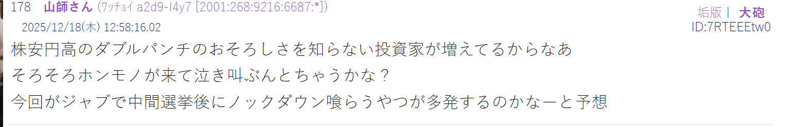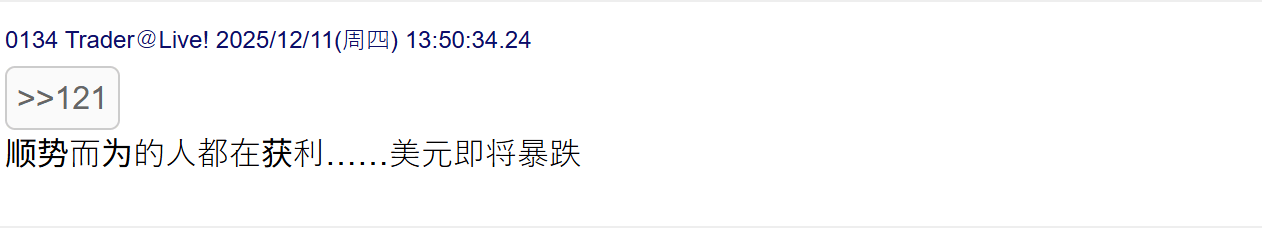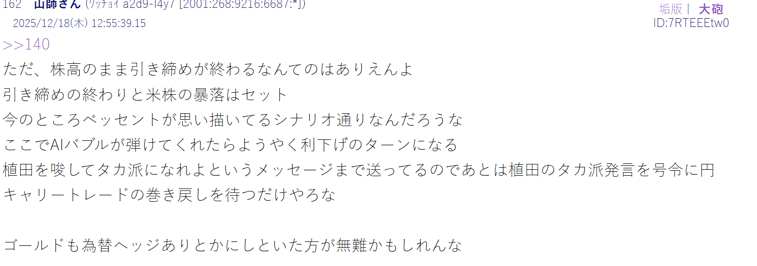 事实上,“渡边太太”们早已嗅到了风向的转变。在12月初日本央行行长释放加息信号后,日本热门网络论坛中就出现了“美元即将大跌”“真正的危机很快就要到来”等言论。