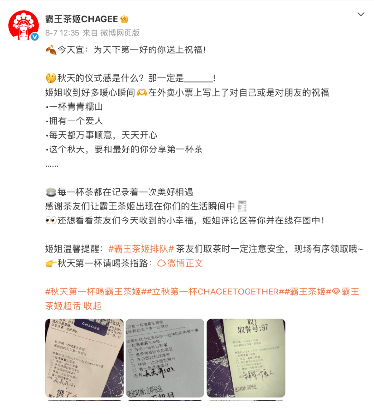 另一方面,品牌深谙社交平台的仪式生成逻辑,积极融入并助推这场年度事件。通过明星互动、达人直播等多元方式,爷爷不泡茶将产品植入“秋天第一杯奶茶”的情感场景中,并以“为外卖员赠送万杯奶茶”等线下行动传递品牌温度,巧妙地将一次饮品消费,升维为一种连接人际、呼应节气、温暖城市的社会化情感实践。