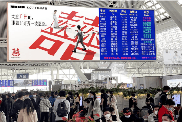在这一角度下,品牌沟通的核心不应止于信息曝光,而在于与消费者共建一个具有情感浓度的“高光场景”。当品牌成功融入消费者策划的某个重要叙事章节时,它便超越了交易关系,成为了他们人生记忆的一部分。今年情人节,利郎以“婚礼季”作为情感载体,通过与年轻消费者共同探索城市人文风貌,实现了品牌传播的强势破圈。利郎将“为爱,回一趟家乡”为核心叙事,联动泉州、郑州、长沙等33座城市,创作了一系列极具地方特色的“家乡版结婚照”。每组影像均巧妙化用城市名称谐音,衍生出如“大庭广州的,那就好好秀一波恩爱”、“和你一起的话,做个西安眼包,也不错”等,将冰冷的地标转化为温暖的情感符号,实现了城市文化与品牌理念的创意融合。在传播层面,利郎以高铁枢纽为核心触点,借助永达传媒的高铁1屏,在33座城市的高铁站展开集中曝光,迅速吸引往来旅客自发打卡,形成从线下场景到线上社媒的传播闭环。在旅客行色匆匆的日常场景中,这些融合家乡与爱意的视觉内容形成了强烈的情感驻足,成功激发打卡与分享,实现了从线下物理场景的“情感引爆”到线上社交媒体的“自发扩散”的完整闭环。作为中国在途场景传播领航者,永达传媒是唯一同时拥有高铁1屏、高铁灯箱、高铁列车这三大高铁核心资源的主流媒体平台。在“日常高光”的趋势下,像高铁站这样承载着离别、重逢与期待的平凡枢纽,正因其超大流量、多元动线与情感浓度,成为品牌为消费者创造“仪式感”与“高光瞬间”的理想场域。利郎的实践表明,当品牌真正融入大众生活必经的“在途”场景,便能将一次寻常的传播,升维为一场与消费者共情、共创的深度情感对话。