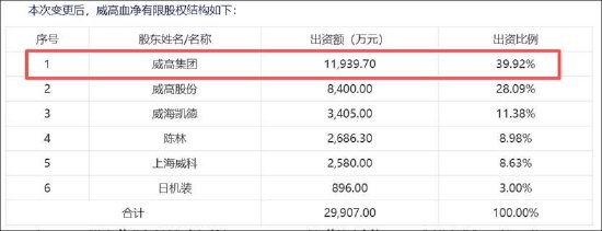 2019年年底,威高集团出资13亿元,获得了威高血净 39.92% 的股权,此次威高血净投后估值对价为30亿元左右。增资后,威高集团(持股39.92%)取代威高股份(持股降至28.09%),成为威高血净的控股股东。