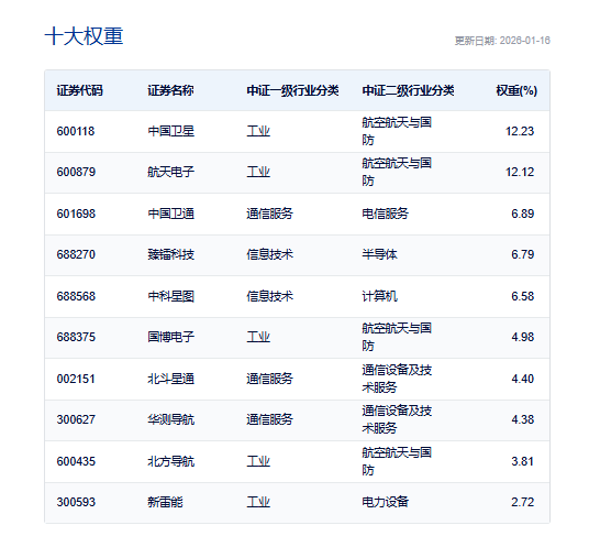 卫星产业ETF(159218)紧密跟踪的中证卫星产业指数,被认为是当前商业航天“纯度”最高指数,其全面覆盖卫星通信、导航、遥感、航天材料等全产业链环节,汇聚中国卫星、航天电子、中国卫通等龙头企业,前十大权重股占比超64%,集中度高。