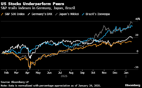 但随着美元在上半年暴跌、就业市场降温以及特朗普敦促欧洲盟友增加国防开支,亚洲、欧洲和拉丁美洲等全球股票市场纷纷跑赢美国。MSCI新兴市场指数去年上涨逾30%,创2017年以来最大涨幅。