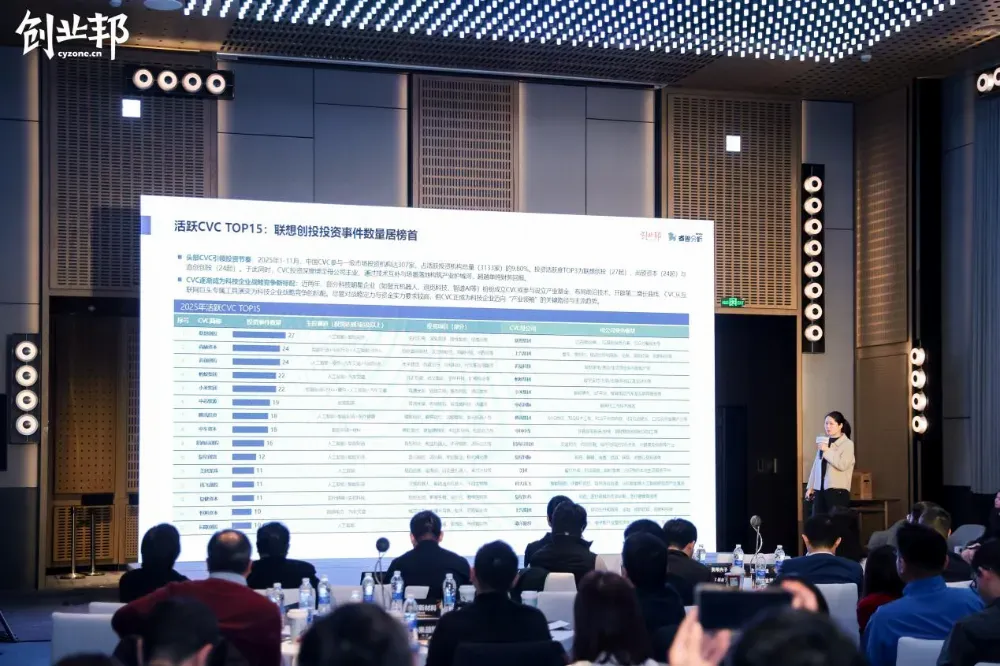 随后,创业邦对《2025年中国企业创投CVC发展报告》进行分享。睿兽分析数据显示,2025年1-11月,在募资方面,CVC新增备案基金规模大幅回落,超过1/3的新增基金在浙粤鲁备案;在投资方面,活跃CVC数量减少27.76%,人工智能和智能制造投资数量及金额“断层领先”,近50%的投资事件集中在北上深三地,其中联想创投投资事件数量居首,CVC参与了40%的大额投资事件,并且新晋独角兽中61.90%有CVC参与;在退出方面,CVC所投的企业IPO渗透率达 33.20%,腾讯投资的项目退出成果显著。