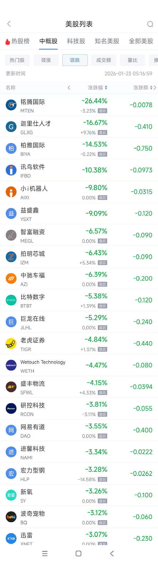 领跌中概股列表: