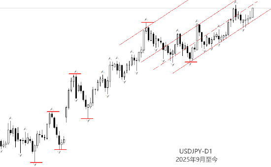 行情方面,USDJPY中长期趋势依旧为显著多头,中期底部和顶部有规律的抬高。最新底分型形成于2025年12月16日,自此之后行情正在寻找新的顶分型。截至目前,两个最新顶分型都不符合要求,预计行情涨势延续,直至中期顶分型出现。图中通道线可以作为实时阻力位,行情与通道交叉时有回落可能。