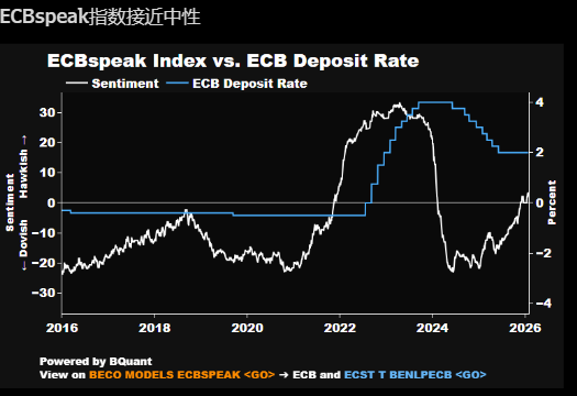 机构研究的内部央行情绪模型ECBspeak Index仍接近中性水平,表明管理委员会在可预见的未来可能维持利率不变。