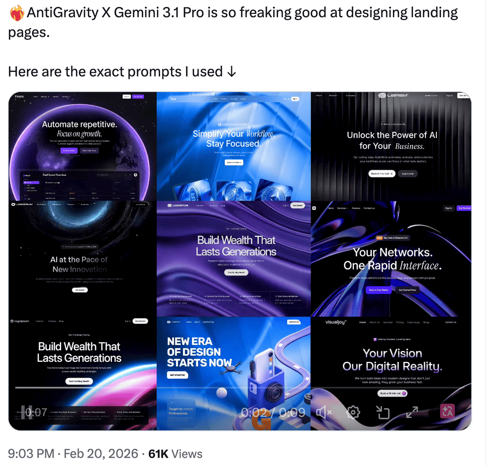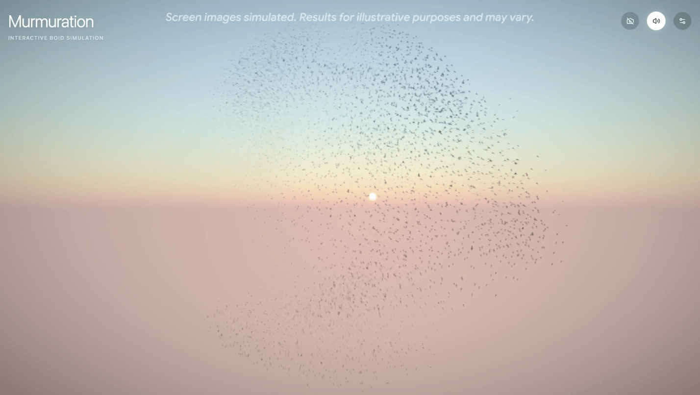 在一个演示中,Gemini 3.1 Pro生成了一套完整的交互式3D椋鸟群舞系统:模型不仅编写了实时渲染的视觉代码,还设计了基于手部追踪的交互逻辑,并生成随鸟群运动动态变化的音乐。最终呈现的并非单一代码片段,而是一个融合视觉、动作与声音的沉浸式体验原型。