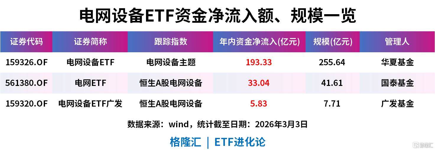 电网设备ETF成为市场关注度最高的赛道之一。今年以来,超230亿元资金净流入相关ETF。其中,电网设备ETF获资金净流入超193亿元,电网ETF、电网设备ETF广发年内资金净流入分别为33.04亿元,5.83亿元。