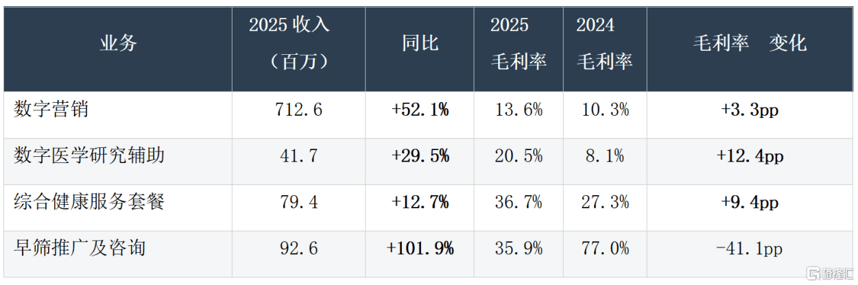 其一,数字营销是当之无愧的主引擎,2025年该业务全年收入7.13亿元,占公司总收入的56.7%,同比增长52.1%。在医药营销全面合规化、数字化的行业大趋势下,该业务快速驱动药企用专业健康内容触达目标患者群体。2025年平台数字营销视频创作量达163,331个,内容浏览量同比激增238.1%,规模效应持续显现。更重要的是,毛利率从10.3%提升到13.6%,意味着公司在医药数字营销领域的议价能力与服务壁垒持续增强。
