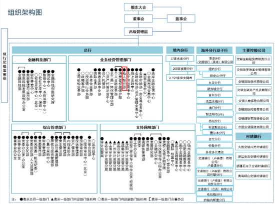 从组织架构看,交通银行2014年度报告曾将“私人银行业务中心(私人银行部)”列在交银集团组织架构图中,成为直营机构之一。同时,北京管理部、金融市场业务中心等也在直营机构之下。