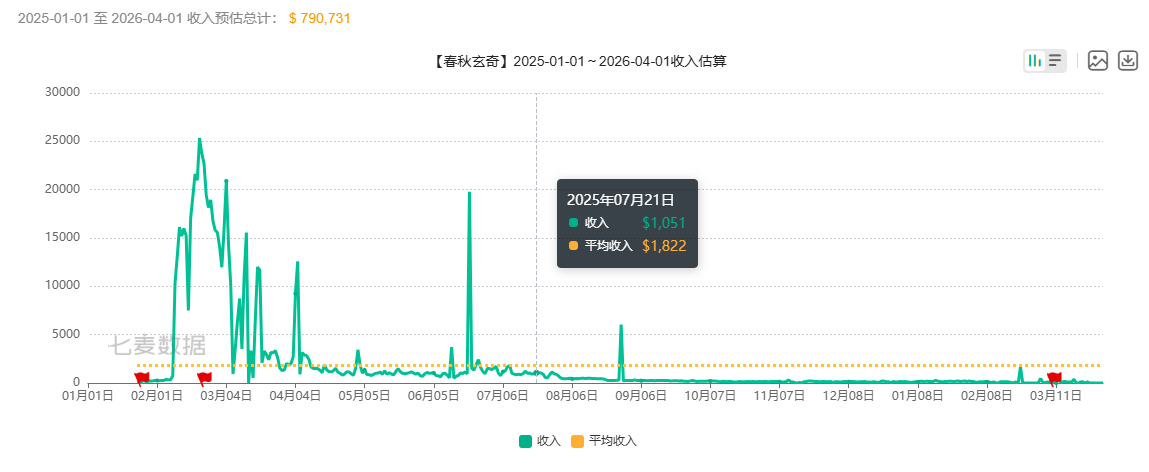 唯一表现亮眼的《春秋玄奇》(微信小游戏),上线三个月累计流水破亿,付费留存率远超同类产品,并于下半年进入利润回收期,但小游戏本身营收规模有限,且赛道竞争激烈,无法成为支撑公司业绩的核心力量,难以扭转整体产品端的疲软态势。根据七麦数据统计,该产品iOS端上线三个月后收入断崖式下滑,日均收入不足2000美元。
