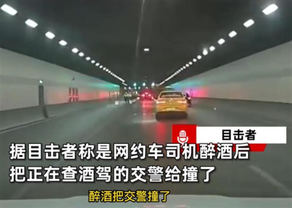 据目击者称,该名网约车司机醉酒后,把正在查酒驾的交警给撞了。