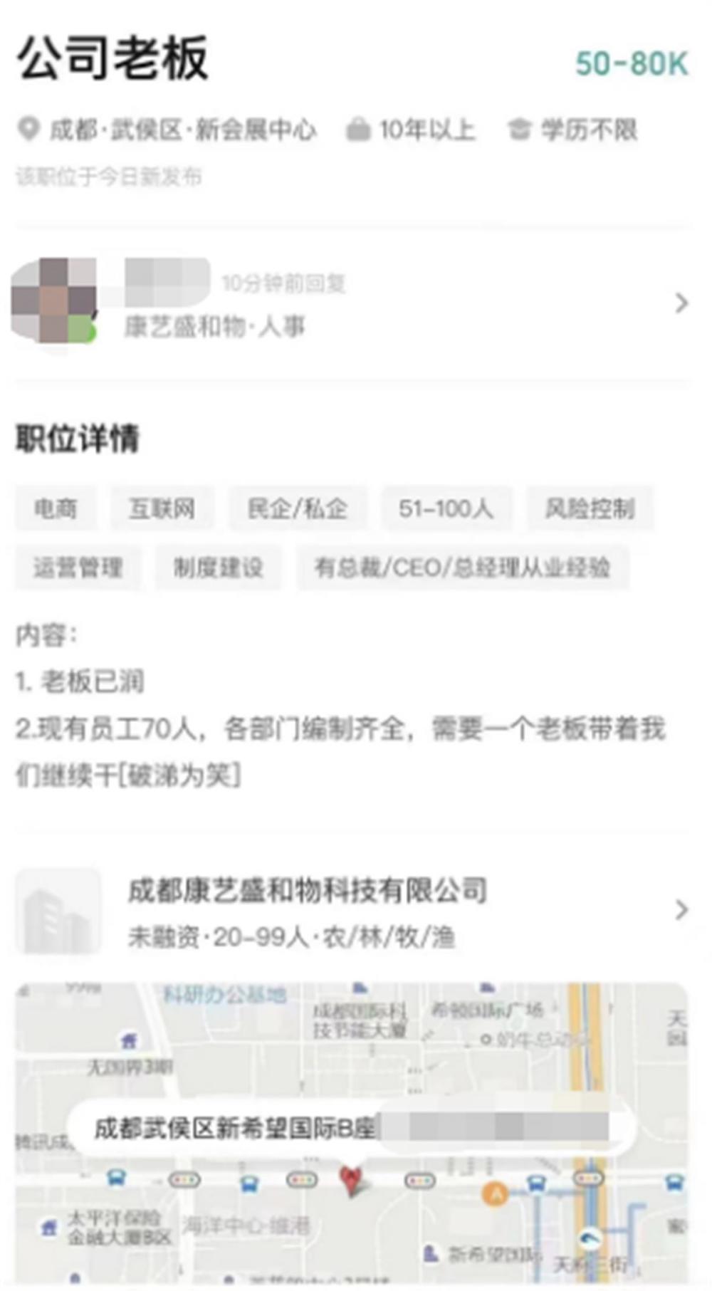 此前发布的招聘公告显示,康艺公司招聘老板,月薪5万至8万元,公告中写道:“现有员工70人,各部门编制齐全,需要一个老板带着我们继续干。”目前,招聘平台上已无法检索到该公告。