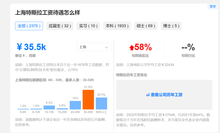根据招聘网站数据,2022年特斯拉平均工资¥27448,比2021年高44%。特斯拉应届毕业生的平均薪资10.5k/月,实习生工资4500元/月。