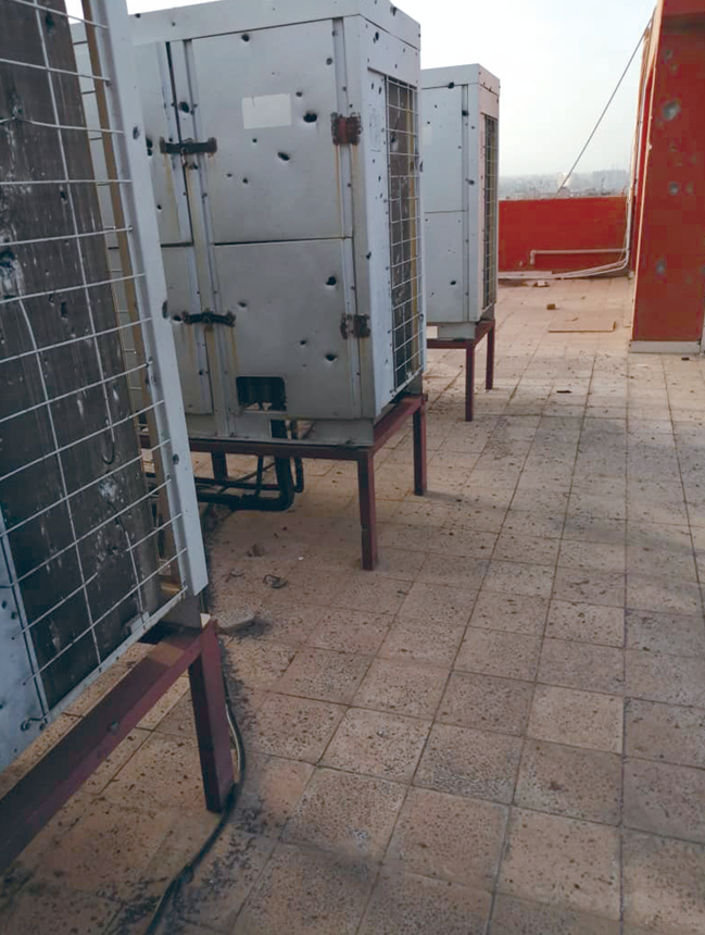 16日,喀土穆一家中资企业楼顶空调外机布满弹孔。(当地中企供图)