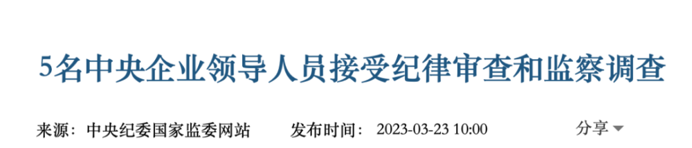 今年3月23日,中央纪委国家监委网站连发反腐消息,5名中央企业领导人员同时被查: