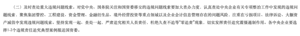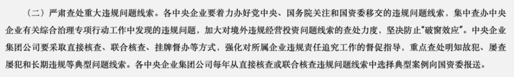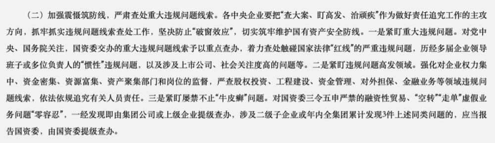 国资委在今年的通知中还特别提到,对党中央、国务院关注,国资委交办的重大违规问题线索予以重点查办。着力查处触碰国家法律“红线”的严重违规问题,历经多届企业领导班子或多位负责人的“惯性”违规问题,以及涉及上市公司、社会关注度高的问题等。通知还明确:强化对企业权力集中、资金密集、资源富集、资产聚集部门和岗位的监督。严查股权投资、工程建设、资金管理、对外担保、金融业务等领域违规问题线索,依法依规追究有关人员责任。对国资委三令五申严禁的融资性贸易、“空转”“走单”虚假业务问题“零容忍”,一经发现即由集团公司或上级企业提级查办,涉及二级子企业或年内全集团累计发现3件上述同类问题的,应当报告国资委,由国资委提级查办。