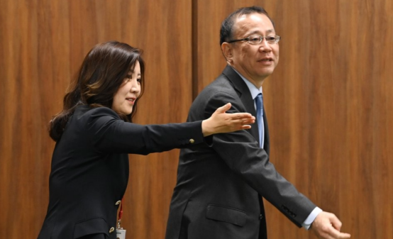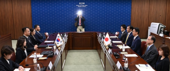 4月17日,第12次韩日安保政策会议在首尔外交部大楼举行。左为韩国外交部亚太局局长徐旻廷,右为日本外务省亚洲大洋洲局局长船越健裕。图源:韩媒