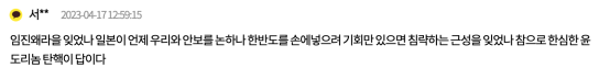 此外,在韩媒评论区,有网友表示,“忘记壬辰倭乱了吗?日本什么时候与我们讨论过安保问题?忘记日本只要有机会就侵略朝鲜半岛的本性了吗?弹劾令人寒心的尹锡悦才是答案。”