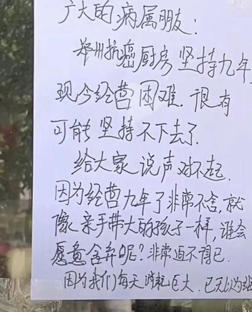 “广大的病属朋友:郑州抗癌厨房坚持九年,现今经营困难,很有可能坚持不下去了。给大家说声对不起,因为经营九年了非常不舍,就像亲手带大的孩子一样,谁会愿意舍弃呢?非常迫不得已。因为我们每天消耗巨大,已无以为继。”