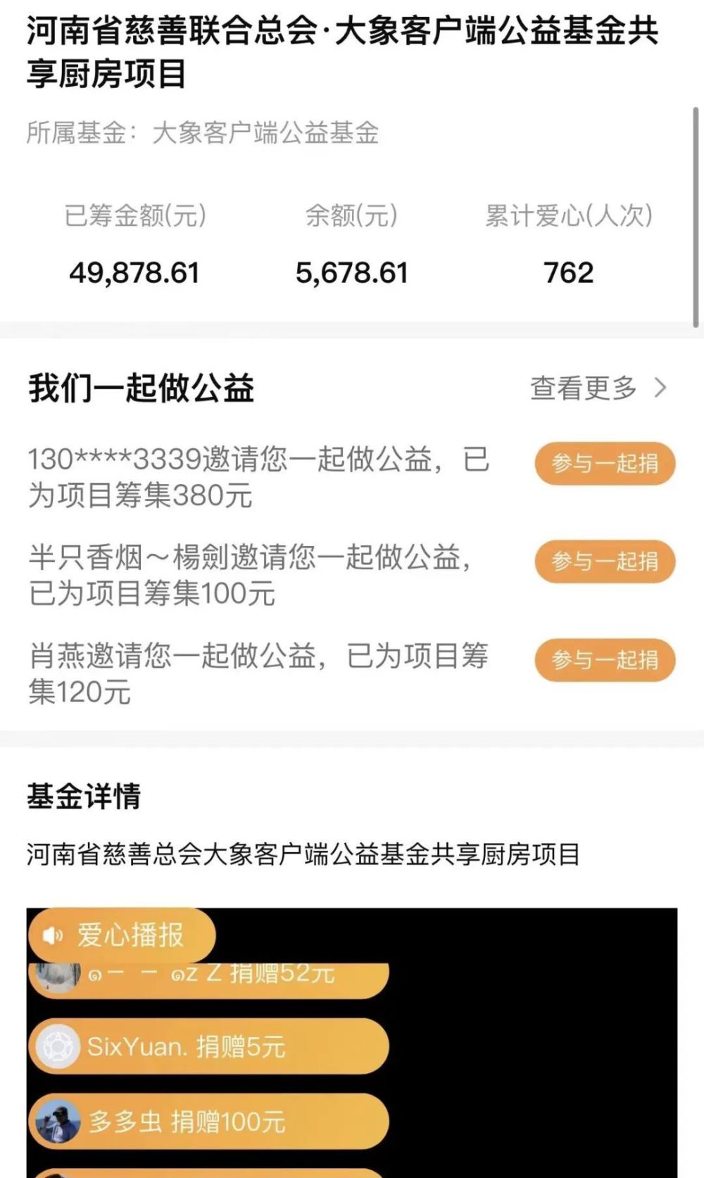 不过,《中国慈善家》调查发现,河南省慈善联合总会早在2021年就设立了“河南省慈善联合总会大象客户端公益基金共享厨房项目”进行公开募捐,2021年3月24日至2023年4月11日,陆续有爱心人士捐款。