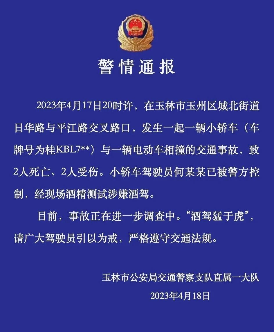18日,玉林交警发布通报称,2023年4月17日20时许,在玉林市玉州区城北街道日华路与平江路交叉路口,发生一起一辆小轿车(车牌号为桂KBL7**)与一辆电动车相撞的交通事故,致2人死亡、2人受伤。小轿车驾驶员何某某已被警方控制,经现场酒精测试涉嫌酒驾。