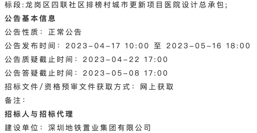 4月17日,深圳公共资源交易公共服务平台发布《龙岗区四联社区排榜村城市更新项目医院设计总承包》招标公告。