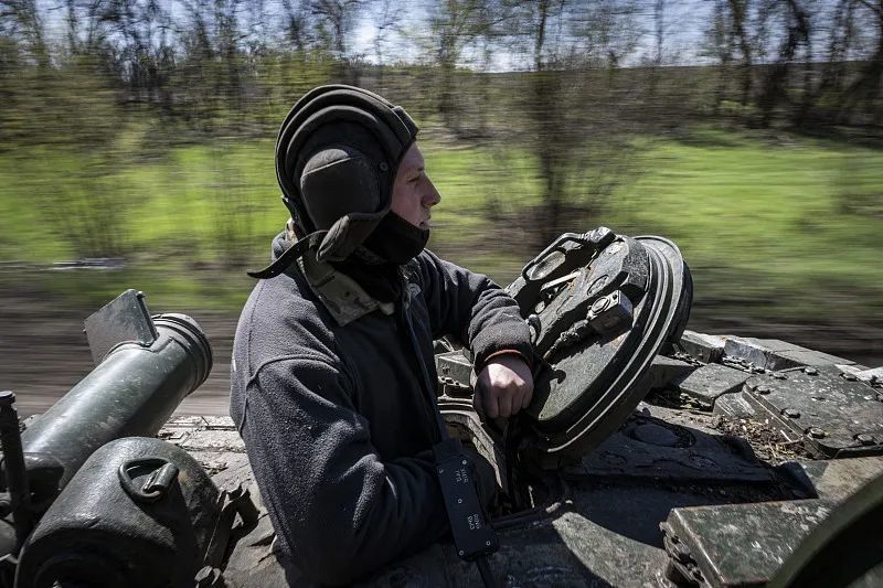 4月17日,顿涅茨克地区,一名乌克兰士兵坐在坦克上。图源:视觉中国