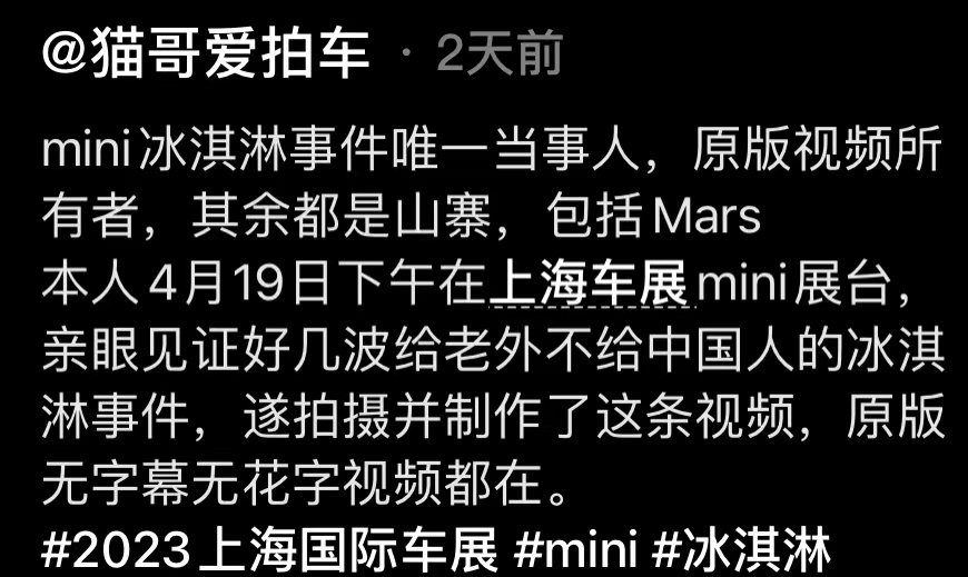 所以总结一下,事件过程很可能就是,mini方面是安排了预留一些冰激凌给外籍员工,礼仪小姐确实不是崇洋媚外,也不是区别对待中国人和外国人,而只是执行了厂商的预定安排,但由于整个过程、话术有漏洞,引发了“区别对待”的正常怀疑。最终,由于宝马Mini没有做出成功的公关,引发了轩然大波。