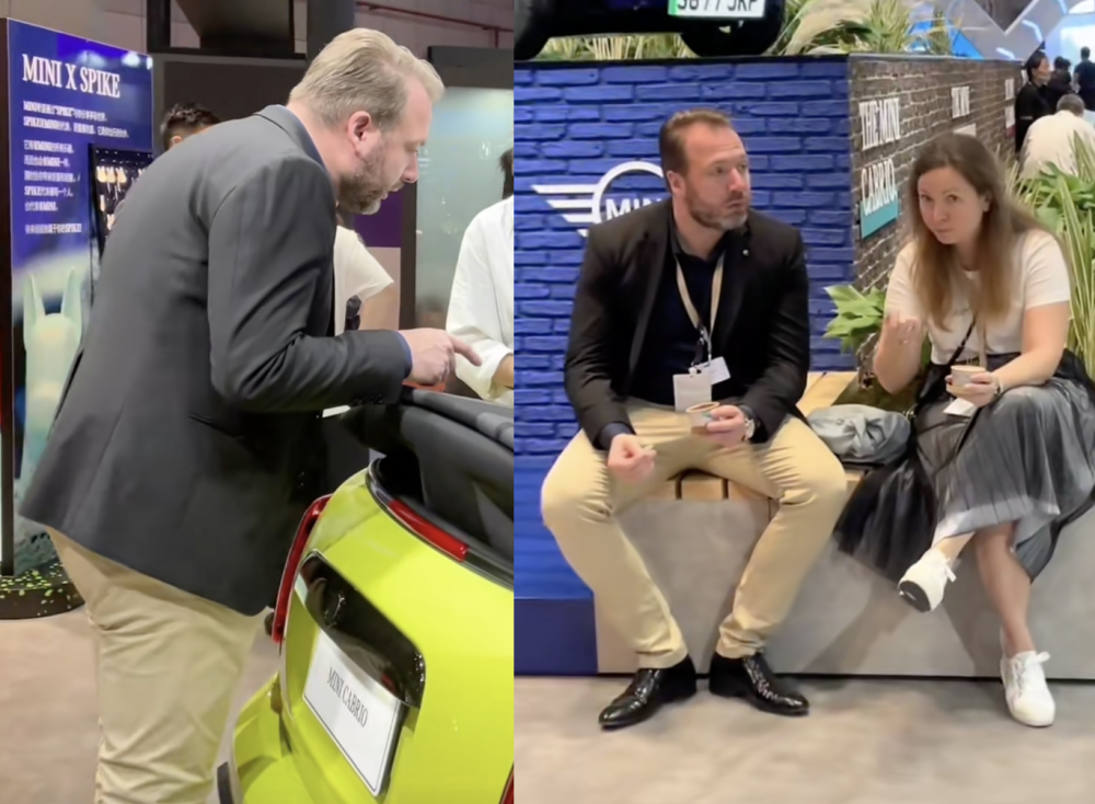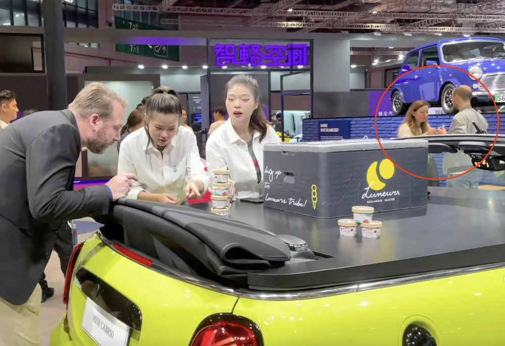 第一,视频的后半段,是好几个老外在吃冰淇淋,其中坐着交谈的一男一女,对比衣着可知男的就是前面领冰淇淋的老外。他胸前有两张胸牌,跟Mini中国第二份声明中“佩戴了员工胸牌”是相符的。另外他们所处的区域也正是Mini展台的座位上。