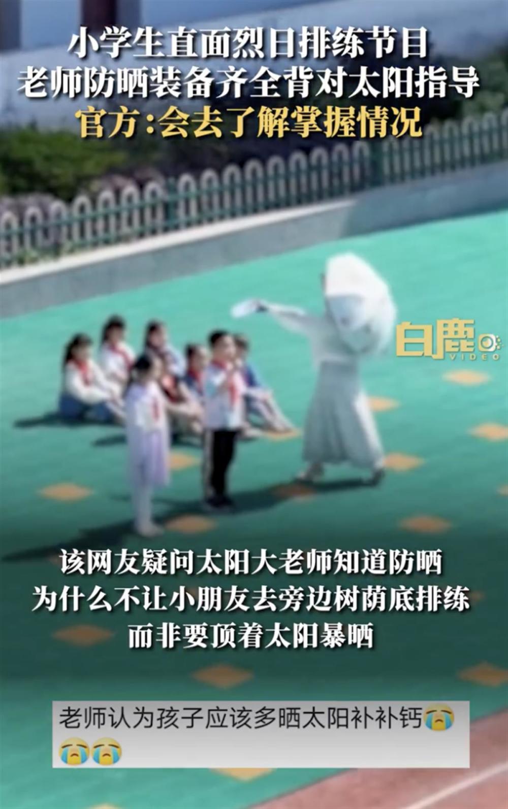 4月21日,安徽黄山祁门县,一网友拍到某小学学生在烈日下排练节目,老师却打着遮阳伞背对太阳进行指导。