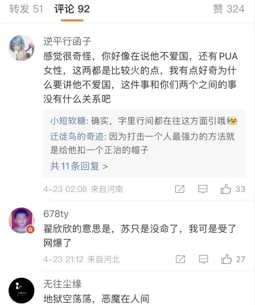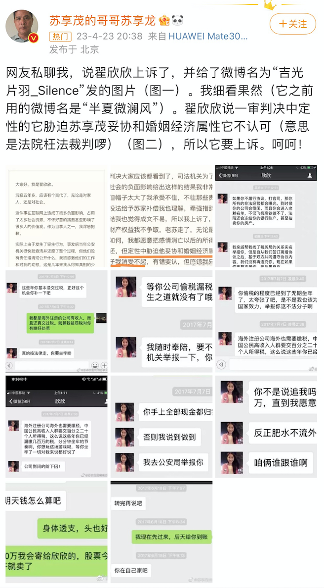 4月22日,疑似苏享茂前妻翟欣欣在微博“吉光片羽_Silence”发文,回应“骗婚”一事。文中表示她不服北京朝阳区法院的一审判决,已经上诉了。字里行间流露出自己为挽回感情曾付出努力,而最终选择离婚的原因归结于“苏享茂不爱国”等主观臆想。不少网友表示这简直是“地狱空荡荡,恶魔在人间”“苏没命了还要被扣上不爱国的帽子,心凉啊”。