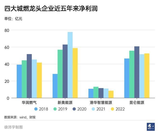 2022年,城燃龙头企业效益全线下滑:新奥能源 (02688.HK) 净利润同比下滑24.4%,至58.65亿元;华润燃气 (01193.HK) 净利润同比下降26.0%,至47.3亿港元;港华智慧能源 (01083.HK) 净利润同比下滑23%,至9.65亿港元;连中石油旗下的昆仑能源 (00135.HK) 净利润也仅增长了1.7%,为52.28亿元。