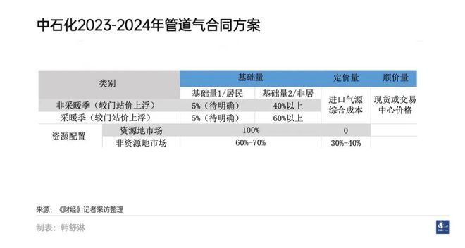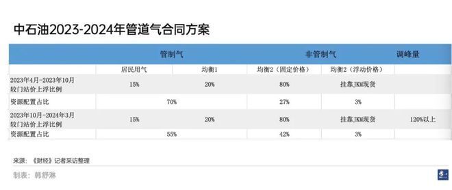 2023年,中石油天然气合同方案是:非采暖季里,均衡一管制气和均衡二非管制气的分配比例为70%和30%;采暖季,管制气和非管制气分配比例为55%和45%,其中均衡一较门站价上浮20%,而均衡二的气量有3%的气量为浮动价格,挂靠JKM (市场机构普氏发布的日韩LNG现货到岸价格) 价格,其余气量较门站价上浮80%。