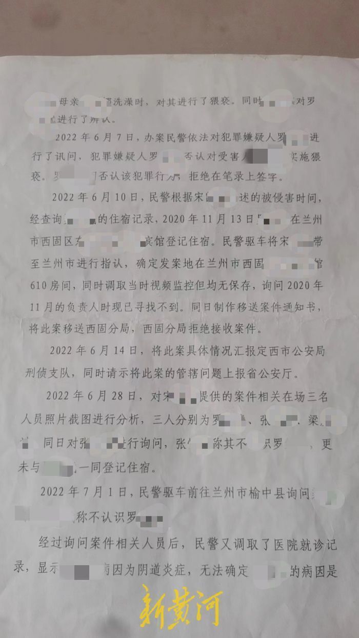 新黄河记者了解到,根据2022年8月18日临洮县公安局八里铺派出所作出的《关于宋XX被猥亵一案情况说明》显示:2022年5月27日,宋先生带女儿到辖区派出所报案。接到报案后警方第一时间开展侦查,由于孩子年龄尚小,不能完整表述案发时间、地点和详细过程。次日,询问其母亲时,对方称确实带女儿前往兰州一家宾馆住宿过,第二天就回了临洮,但住宿期间并无他人,也未发生猥亵行为。办案民警对罗某进行询问,对方否认猥亵一事。