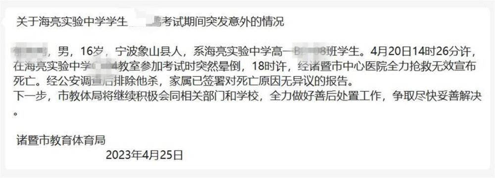 近日,浙江绍兴诸暨市海亮实验中学一名16岁男生在校内去世。4月25日,极目新闻从诸暨市教育体育局了解到,这名男生在参加考试时突然晕倒,经抢救无效宣布死亡,警方调查后排除他杀。