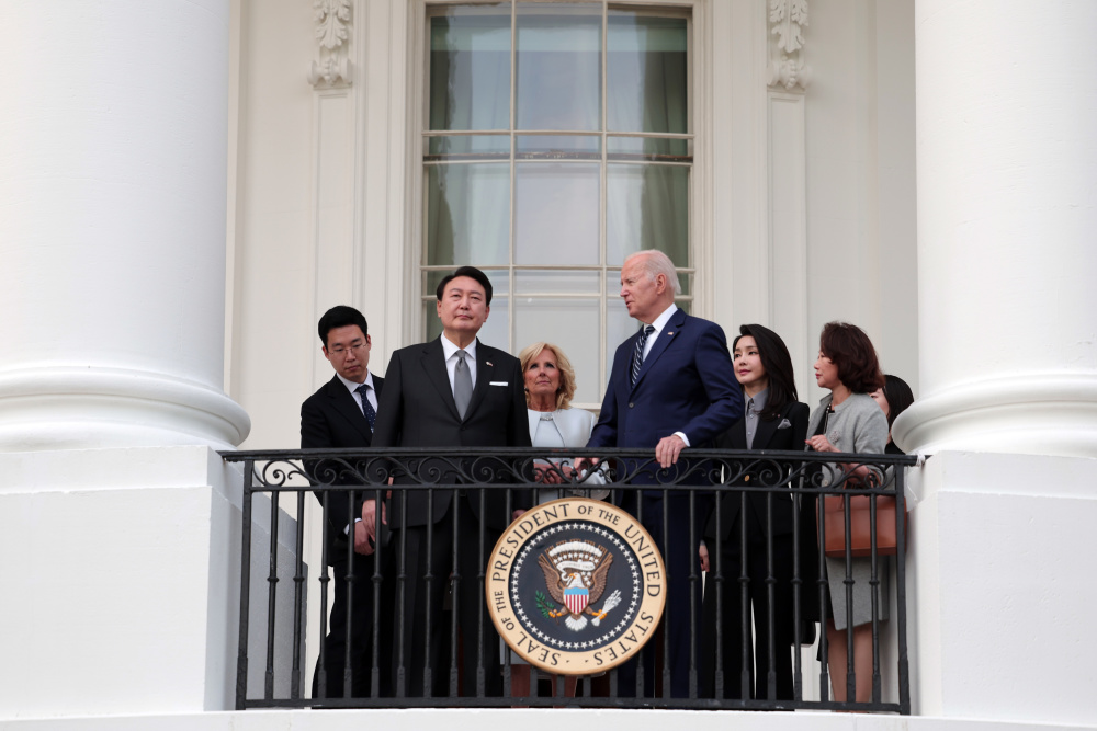 ▲当地时间2023年4月25日,美国首都华盛顿,正在美国进行国事访问的韩国总统尹锡悦携其夫人与美国总统拜登和第一夫人吉尔·拜登在白宫阳台上观景。图/IC photo