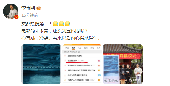 刚刚,李玉刚通过微博回应称,“突然热搜第一!电影尚未杀青,还没到宣传期呢?心直跳,冷静。看来以后内心得承得住。”