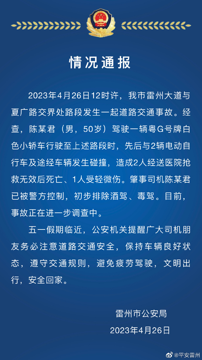 2023年4月26日12时许,我市雷州大道与夏广路交界处路段发生一起道路交通事故。经查,陈某君 (男,50岁) 驾驶一辆粤G号牌白色小轿车行驶至上述路段时,先后与2辆电动自行车及途经车辆发生碰撞,造成2人经送医院抢救无效后死亡、1人受轻微伤。肇事司机陈某君已被警方控制,初步排除酒驾、毒驾。目前事故正在进一步调查中
