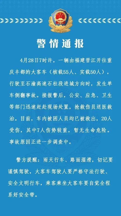 4月28日7时许,一辆由福建晋江开往重庆丰都的大客车(核载55人、实载50人)行驶至石渝高速石柱段进城方向时,发生单车侧翻事故。接报警后,公安、应急、卫生等部门迅速赶赴现场处置,抢救伤员送医救治。目前,车内被困人员均已被救出,20人受伤,其中7人伤势较重,暂无生命危险。事故原因正进一步调查中。