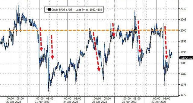 纽约黄金期货在周四欧市盘初刷新日高至2013.3美元,日内涨近0.9%,美国GDP和PCE指数公布后迅速转跌,并跌穿2000美元,美股盘初刷新日低至1982美元,日内跌0.7%,美股午盘转涨。