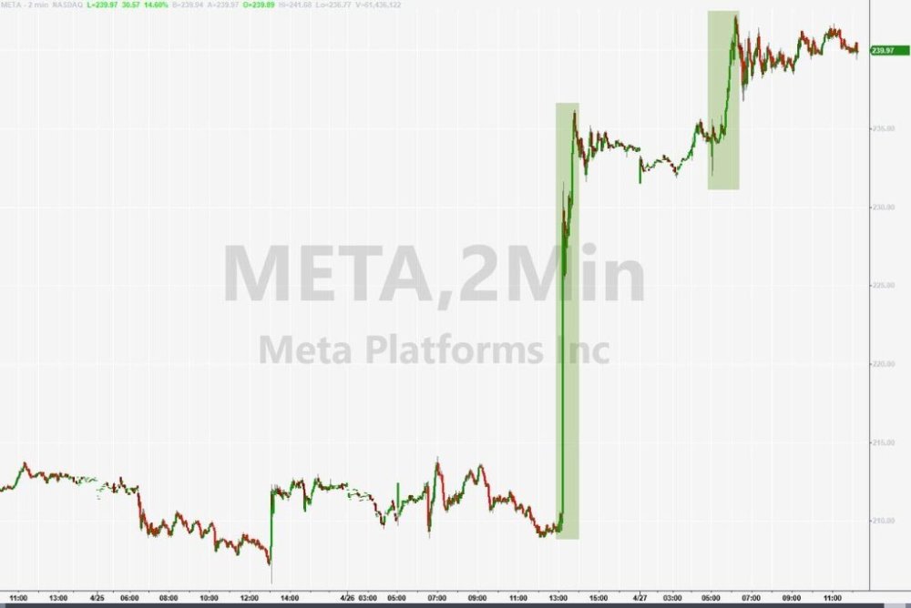 龙头科技股盘中至少涨近2%。周三连跌三日至1月25日以来低位的特斯拉收涨4.2%,抹平周三多数跌幅。FAANMG六大科技股中,在周三公布一季度业绩优于预期且扎克伯格强调AI推动业绩、AI是主要抓手之一后,Facebook母公司Meta跳空高开逾14%,盘中曾涨超15%,收涨约14%,创2月2日四季度财报公布次日以来最大涨幅,创去年2月2日以来收盘新高;亚马逊收涨4.6%,盘后公布财报后,盘后先加速上涨,涨幅曾超过10%,后逐步回落,目前转跌; 连跌两日、一再刷新3月31日以来低位的谷歌母公司Alphabet收涨3.7%,涨至4月14日以来高位;公布一季报后周三大涨逾7%的微软收涨3.2%,创去年4月初以来新高;周三大致收平的苹果收涨2.8%,涨至去年8月以来高位;周三连跌两日、刷新3月23日以来低位的奈飞涨近1.5%。