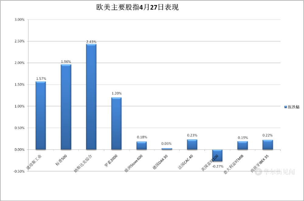 纳指收涨2.43%,创3月16日以来最大涨幅,报12142.24点,创4月19日上周三以来收盘新高。标普收涨1.96%,报4135.35点,走出截至周三连续两日所创的3月30日以来收盘低位。截至周三连跌两日至3月31日以来低位的道指收涨524.29点,涨幅1.57%,报33826.16点,和标普均创1月6日公布12月美国非农就业报告当天以来最大涨幅,均接近抹平本周前三日所有跌幅。
