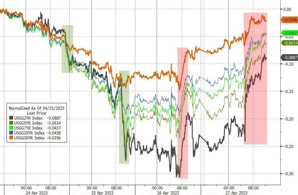 对利率前景更敏感的2年期美债收益率在亚市早盘刷新日低下测3.92%,午盘曾接近4.11%刷新日高,回到4月24日以来盘中水平,日内升逾17个基点,远离周三下破3.87%所刷新的4月7日以来低位,日内升个基点,到债市尾盘时约为4.07%,日内升约13个基点。