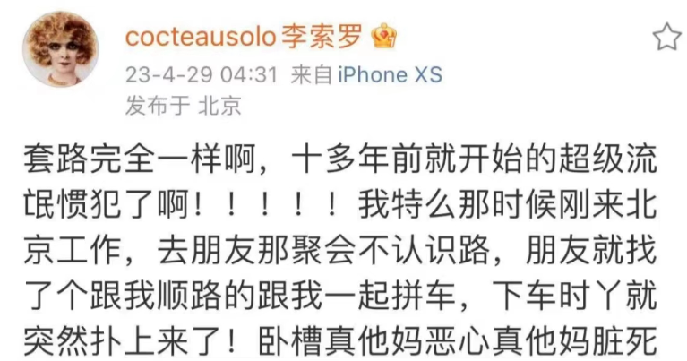 性骚扰面临的取证困难,是多数受害者面临的窘境。在微博上曝光史航曾在十多年前拼车时骚扰自己的“cocteausolo李索罗”就指出了这一点。她提出,除非受害者事先准备好了录下来,否则很难取证。